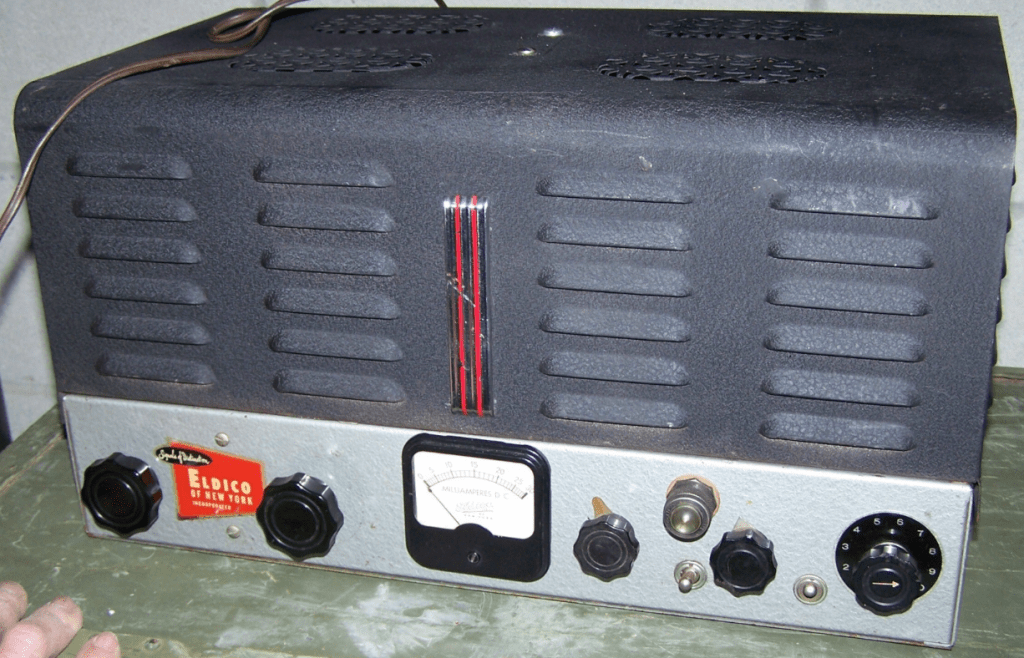 Eldico TR75TV – 2 tube crystal controlled transmitter, most were kits, 6AG7 crystal controlled oscillator driving 1625 amplifier built on a . It was the most popular novice class commercial transmitter in the early 1950s. The components were surplused high quality new parts that had been by our government after WWII. The power supply filter capacitor was an oil filled unit. Ceramic coil forms were used. The chassis was a 17X10X9 inch chassis. The 1625 amplifier was supplied with a DC voltage of 550 volts and turned for a DC current of 110 mills max which resulted in 60 watts input that produced about 40 watts output.