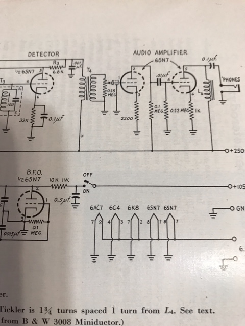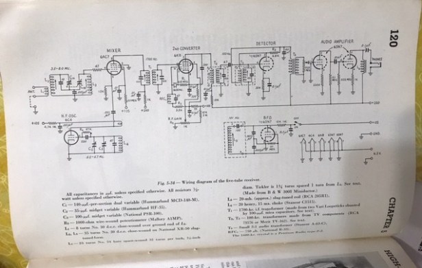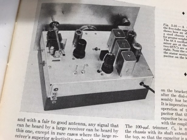 My 1957 ARRL Handbook contains the plans. It has 5 tubes, not counting the power supply’s tube rectifier. The radio is dual conversion, 1700 KC first intermittent frequency amplifier and a 100 KC second i.f. amplifier. A 6C4 takes the role of the H.F. oscillator. A 6SN7 serves as a 2 stage audio amplifier. The 100 KC i.f. transformers were in reality coils manufactured to serve as TV set horizontal oscillator coils that Goodman modified for his receiver to serve his needs. The power supply was built in a separate chassis.