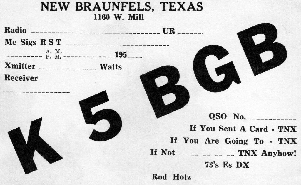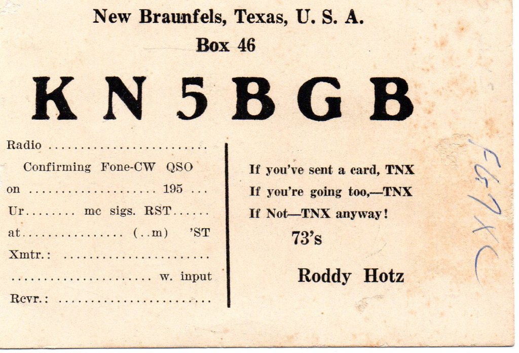 Not long ago an old radio friend of mine who lives down in Malfunction Junction (College Station) touched base with me. Rod Hotz, K5BGB, had received a surprise gift from another ham who had purchased a large group of old QSL cards of yesteryear from eBay. In the group was a QSL card which Rod had sent to another ham. Rod’s QSL had a clever ditty on it and was an attention getter and probably increased the percentage of QSL cards he receiver per card sent. The ditty was cute and truthfully rather polite. He also had the QSL the other fellow had sent to him. Rod then provided me with pictures of his novice QSL card and early general class card to jog my memory.